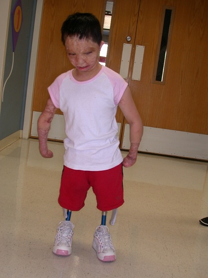 小泽走路。爸爸说小泽刚从美国回来时一天带两,三个小时假肢,现在整天戴着假肢到处走。